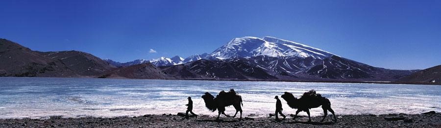 宽阔漫长的路途上,巨大绵延的冰山前,只有两个人与两只骆驼的剪影。画面好似可以无限延展,一直到天的尽头去。
