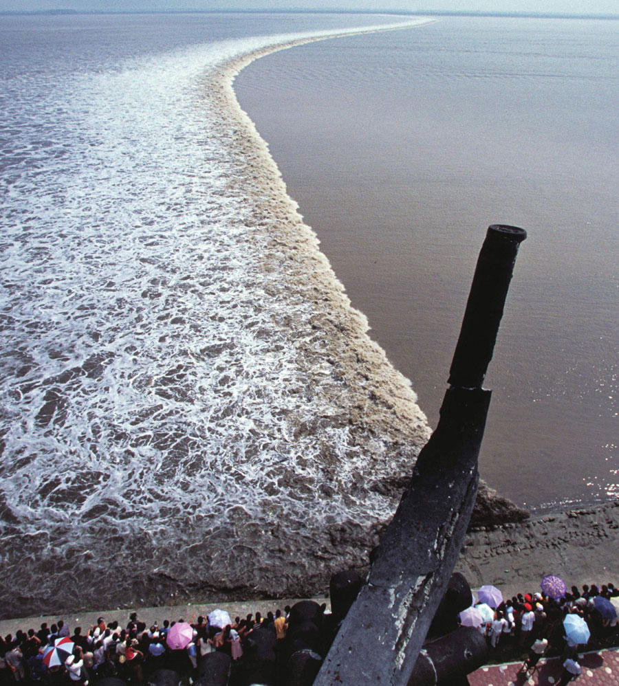 一线潮,在八月十八日这天,太阳、月亮、地球几乎排在了同一条直线上,此时海水受到的引力最大,再加上钱塘江独有的地形和风势,就形成了这千古奇观。