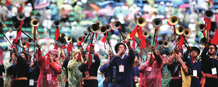 贵州都匀,是一个偏远的苗族自治州的首府。每年六七月间,都会举办苗族六月六风情节。被长镜头虚化的背景里,是密密麻麻的人群,撑着缤纷的伞,兴致勃勃地观看这场热闹非凡的表演。