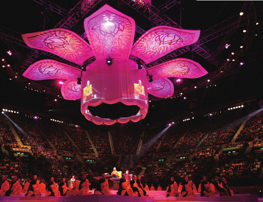 香港红馆,一盏巨大的莲花顶灯,繁复的花纹中透露出柔和洁净的光。众人围绕着大师,静静倾听他的演讲。