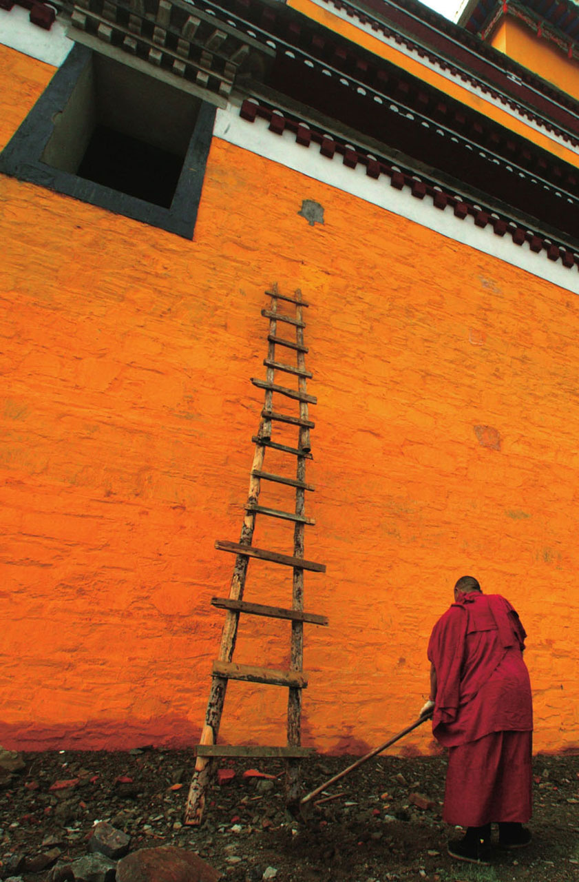 刚刚粉刷过的醒目砖墙,是一道“戒”,告诫出家人既入佛门,就必须四大皆空,静心修佛方得正果。