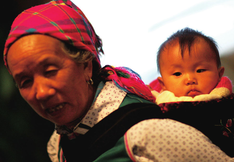 老人褶皱而憔悴的面容记录着岁月的沧桑,孩童吹弹可破的肌肤好似刚刚孵化。一老一少具有强烈的反差,显示出生命的张力。