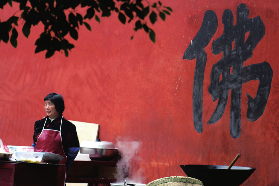 老妇人身后的巨大佛字,也充满她的内心。她一心向佛,一心为了受苦的人民,早早起来烹制热气腾腾的斋饭,供人们享用。如此微小的布施,也定会化作一泓清泉,滋润人心。