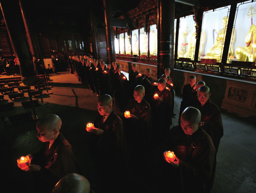 第三届中国普陀山南海观音文化节闭幕式上,在普济寺举办的“点亮心灯”传灯法会,从寺院一直延伸到海印池。