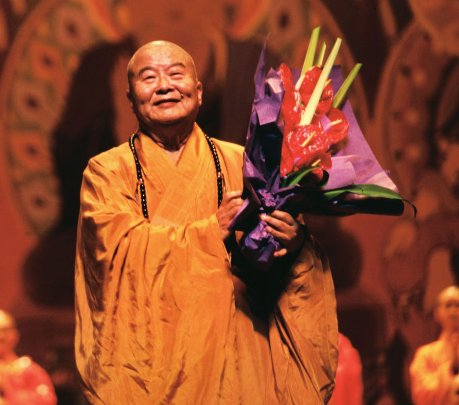 星云大师双手捧着一束艳丽的花,笑意满满,上台做最后的感谢。