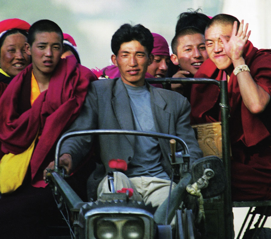 在香格里拉的一位藏族小伙子,开着拖拉机,载着他的家人以及一车的青年喇嘛去田间收青稞。
