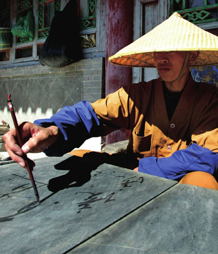 练字,是这位僧人每天必做的功课。他提着笔的右臂愈来愈有分量,用笔蘸水,一挥而就。写字如播种,洒下一个“勤”字,才得刚劲笔锋。练出人生的感悟,练出深入骨髓的不屈性格。