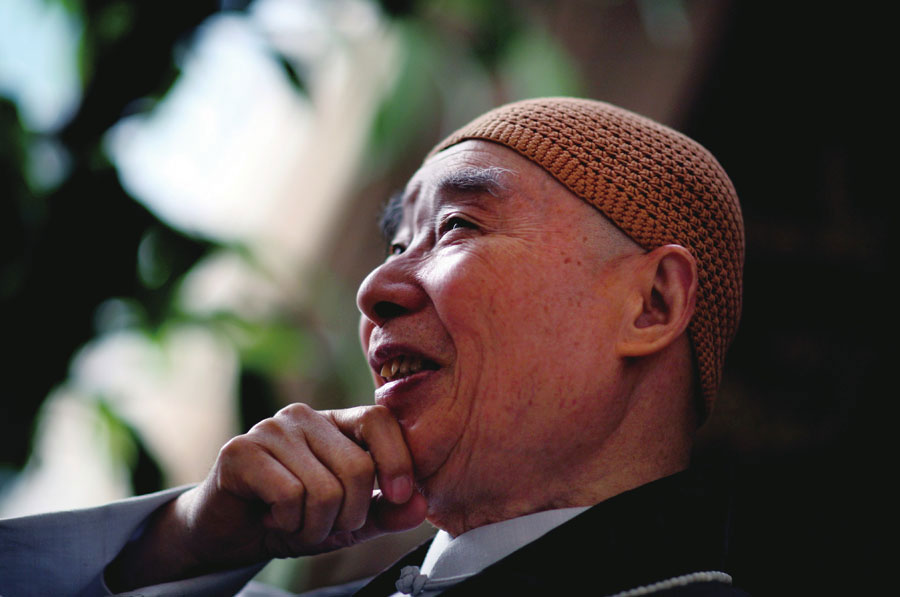 净空法师头裹土棕色的毛线帽,仿佛北京胡同里一位眉开眼笑的慈祥老人,坐在四合院的门口为孩子们传经布道。