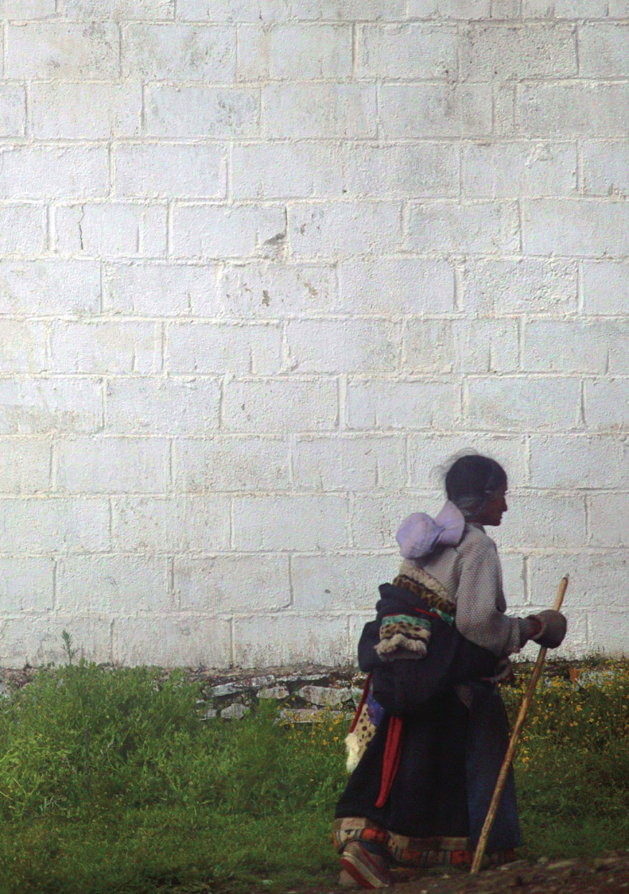 冬日清晨,一位转经的老阿妈,途经一面巨大的灰白色的寺墙。