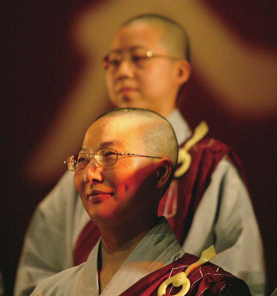 合唱过程中,背景的大屏幕上会打出相应的佛语或训诫,帮助观众理解佛光人的理念。那笑容满溢的比丘尼背后,是大大的“参”字。这也是星云大师喜欢这张照片的原因,有着年轻僧人勤奋参学的深意。